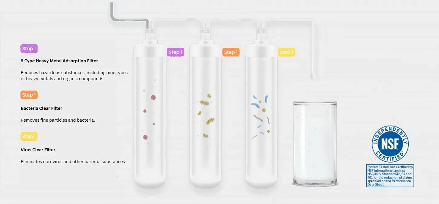 Enhances the taste of water by removing nine harmful heavy metals and bacteria with multi-stage filtration.