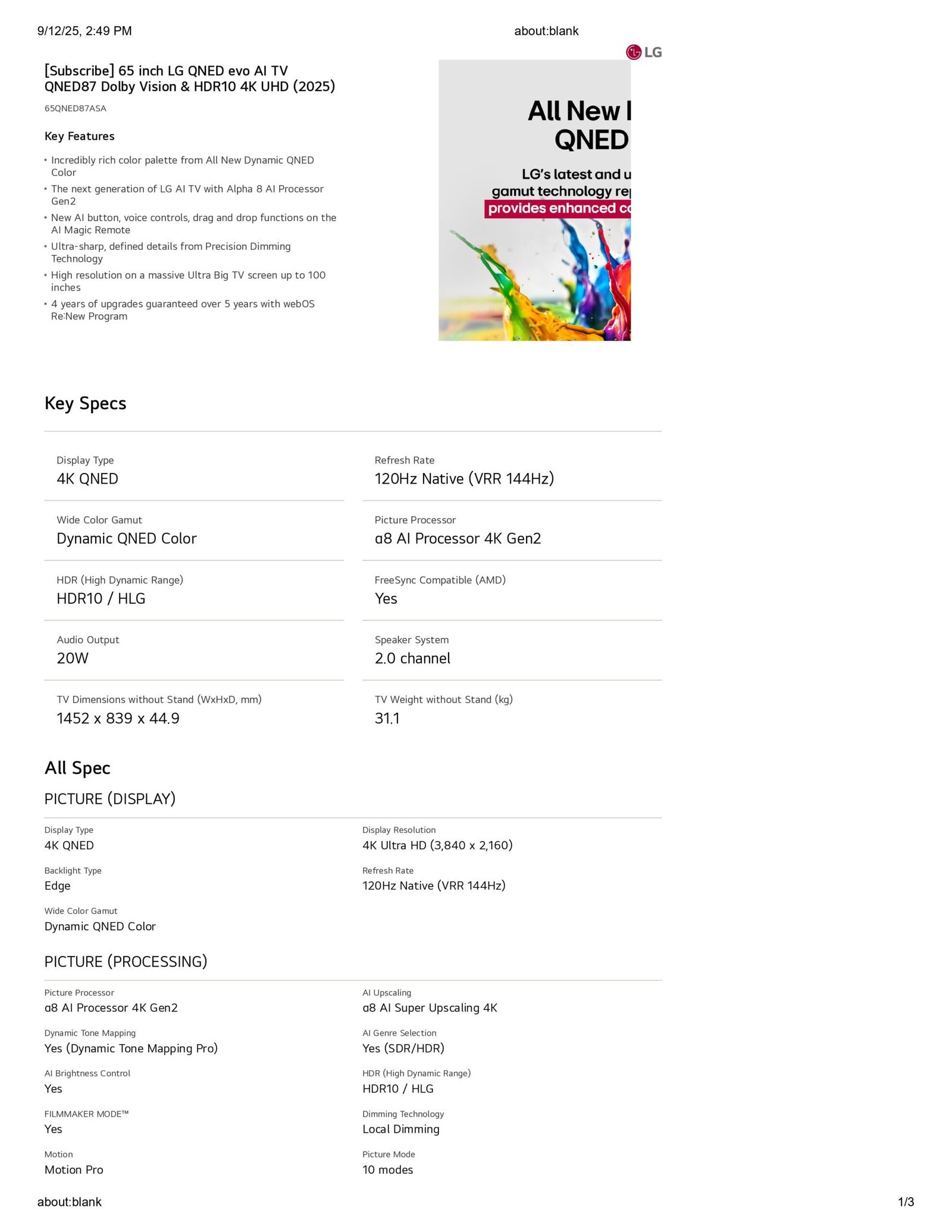 LG QNED evo AI TV QNED87 Dolby Vision & HDR10 4K UHD