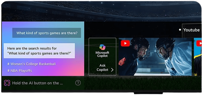 Ask your TV anything. Built-in AI recognizes your voice and swiftly provides personalized recommendations to your requests. You can also get additional results and solutions with Microsoft Copilot.