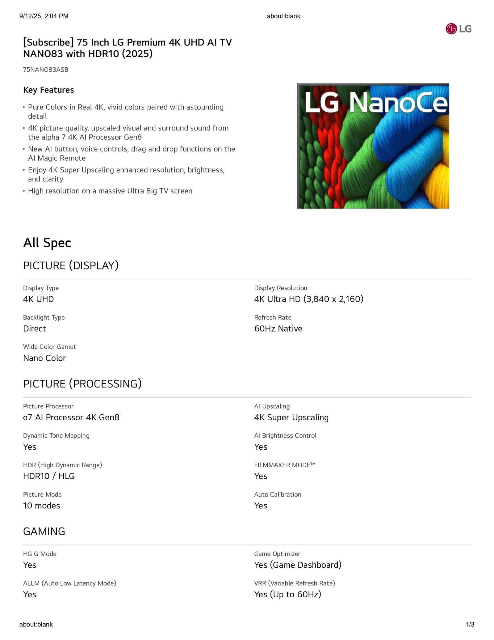 LG Premium 4K UHD AI TV NANO83 with HDR10