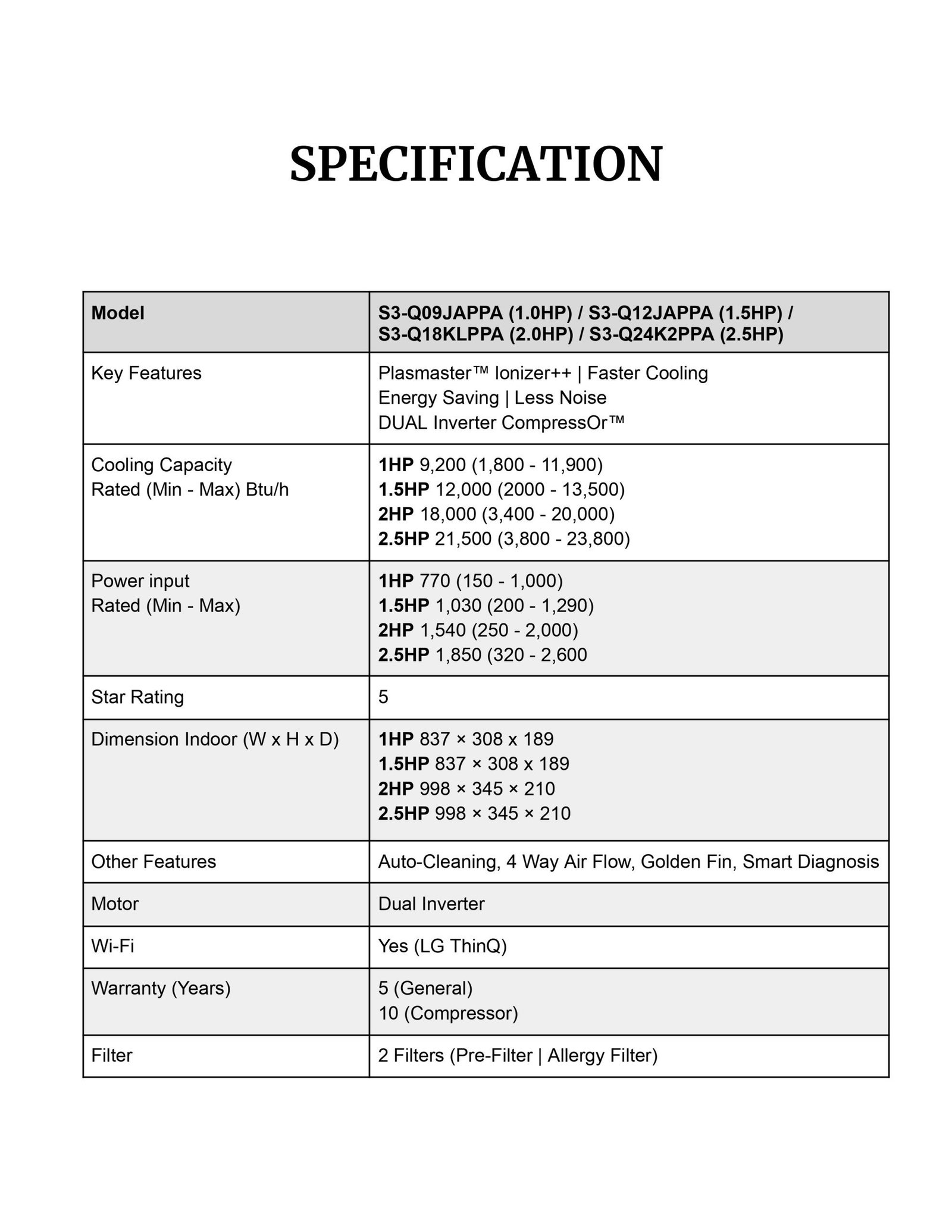 - Low Energy Consumption: Yes (Smart Inverter Compressor)
