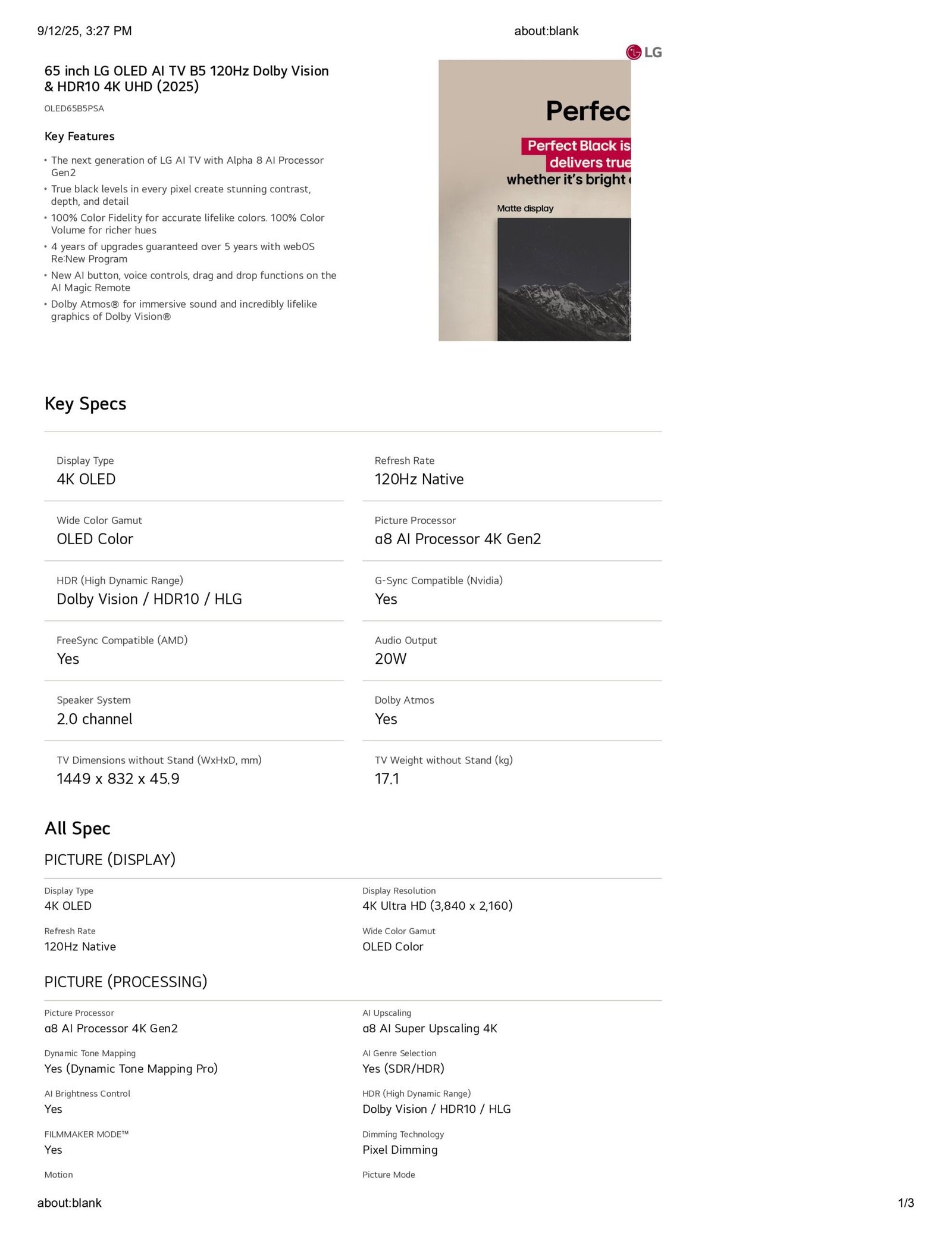- Model: OLED65B5PSA