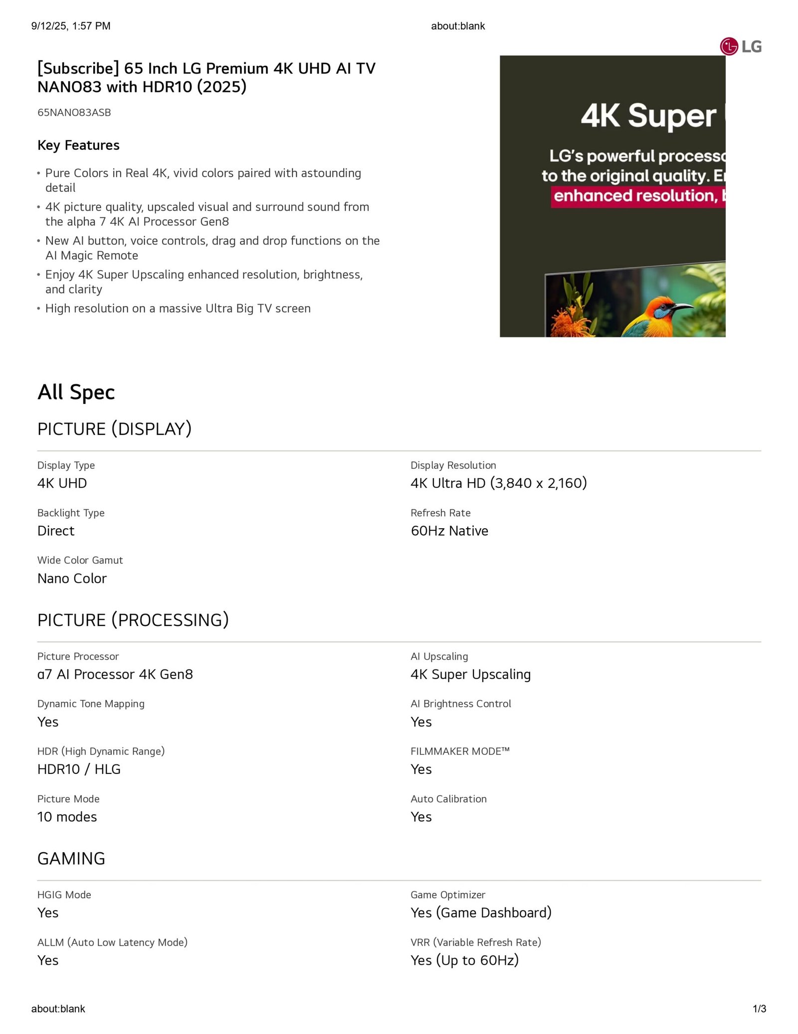 LG Premium 4K UHD AI TV NANO83 with HDR10