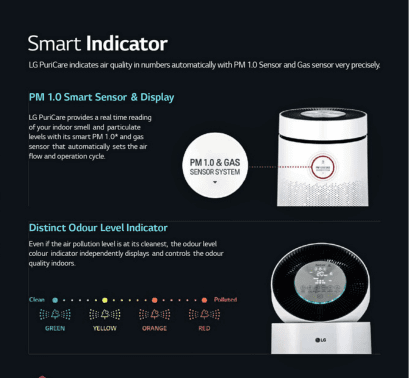 LG PuriCare provides a real time reading of your indoor smell and particulate levels with its smart PM 1.0 and gas sensor that automatically sets the air flow and operation cycle.