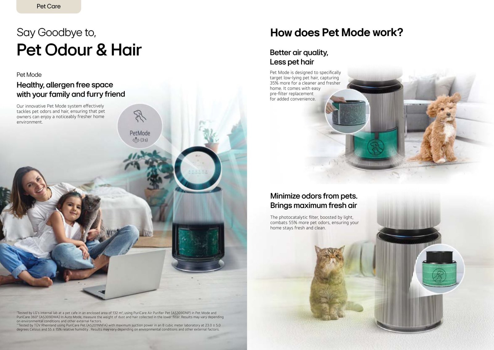 Pet Mode works by reducing low-lying pet hair and minimise pet odour. This mode targets low-lying pet hair, capturing 35% more for a cleaner and allergen free space. The photocatalytic filter, boosted by light, combats 55% more pet odors so all pet owners can enjoy a noticeably fresher home!