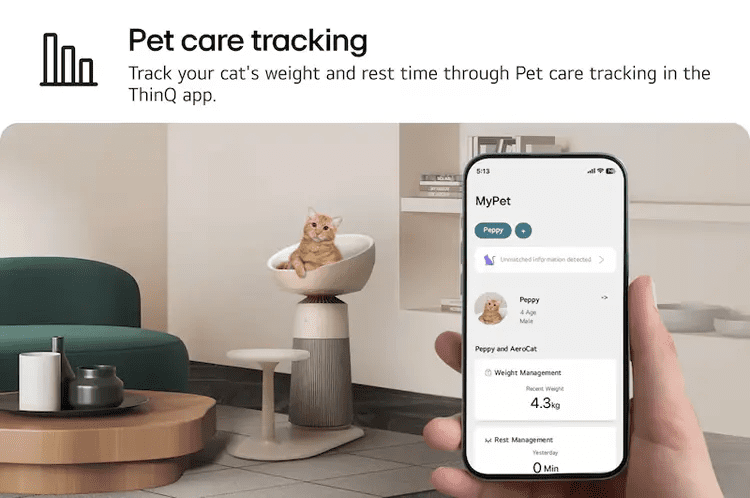 Easily control your purifier and monitor your cat’s weight and resting time LG ThinQ, anytime, anywhere.