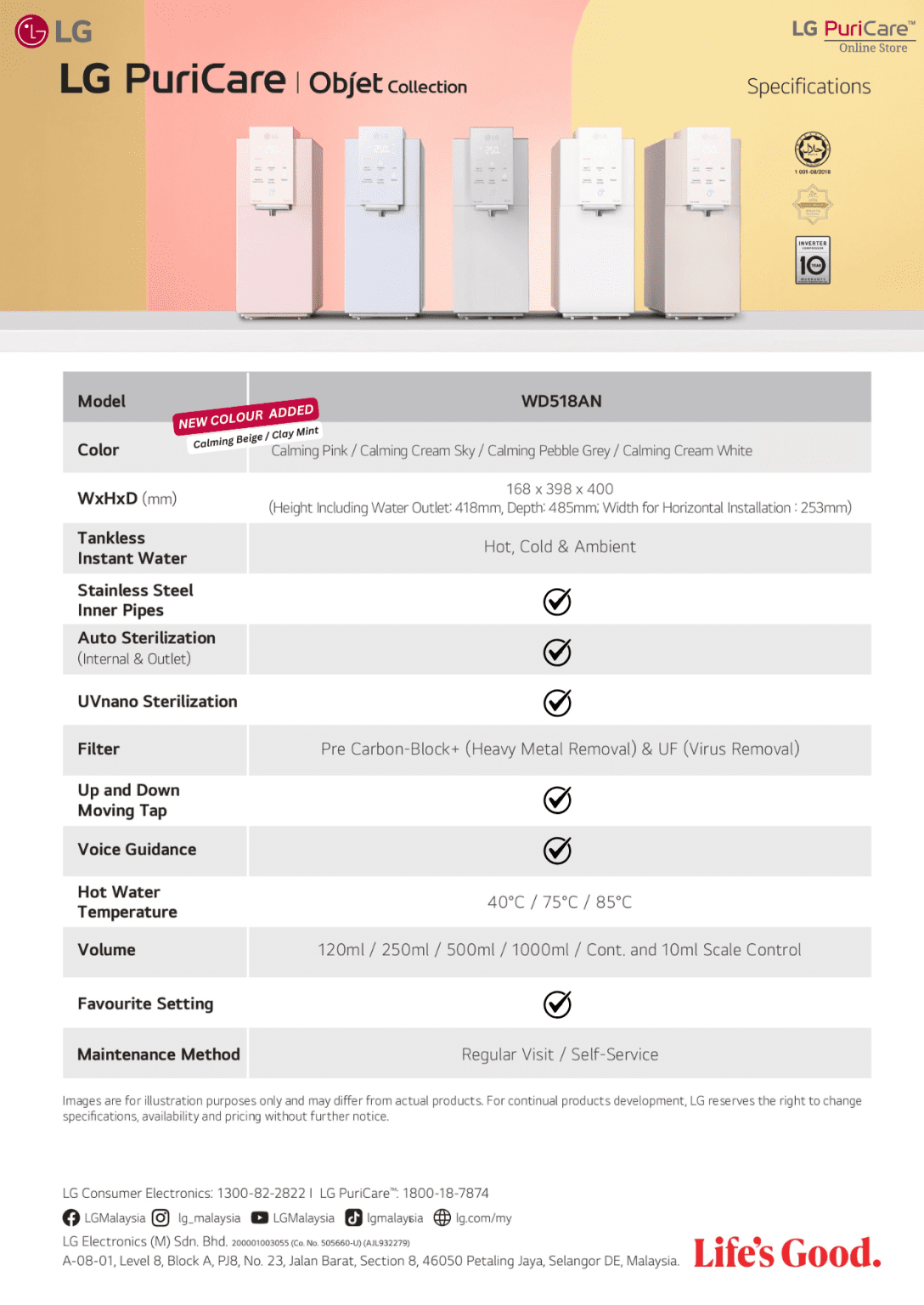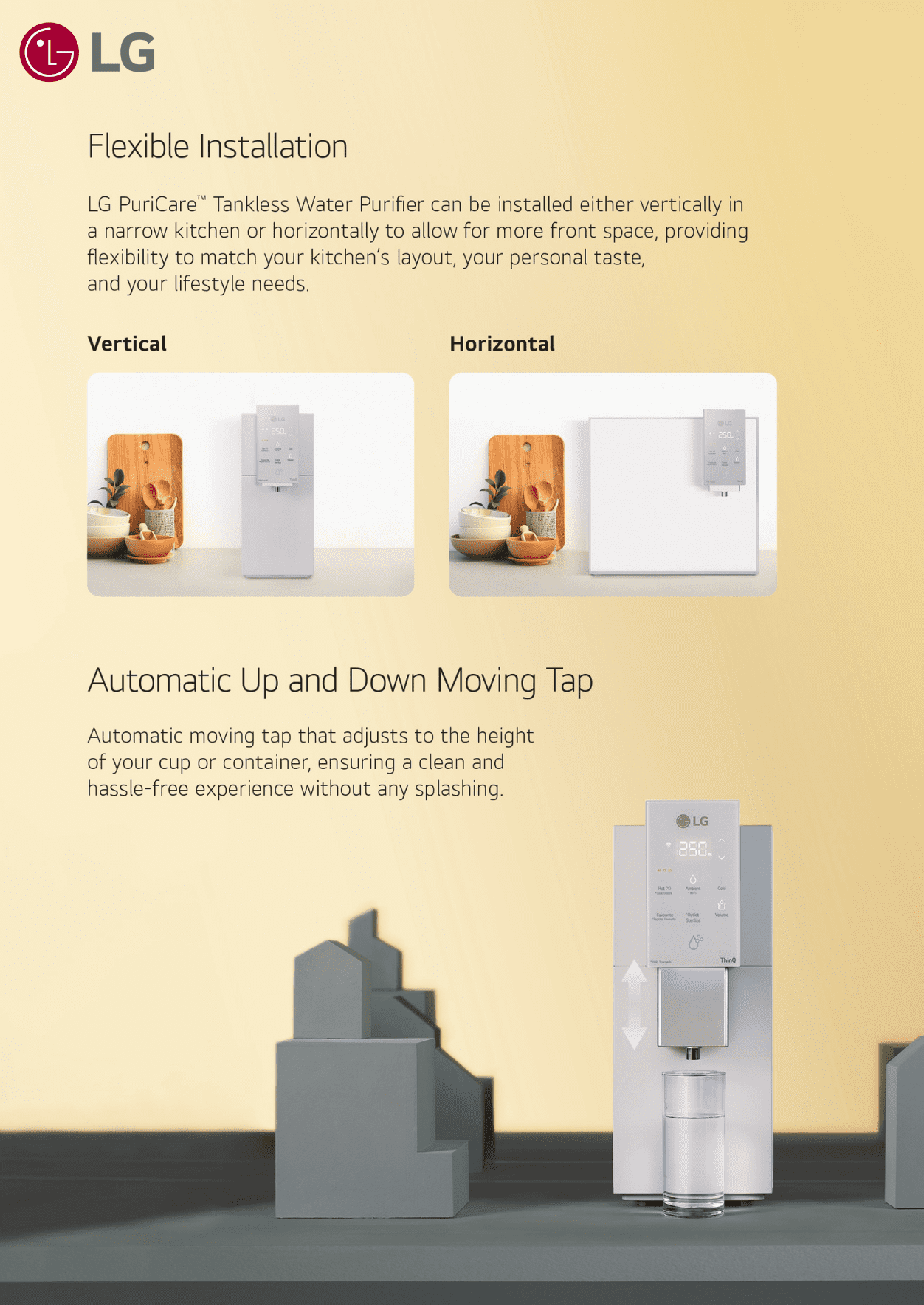 Sleek and Smart, Kitchen Aesthetic LG PuriCare Tankless Water Filter comes in four different colour options, compact and stylish making it easy to fit into most kitchen spaces.