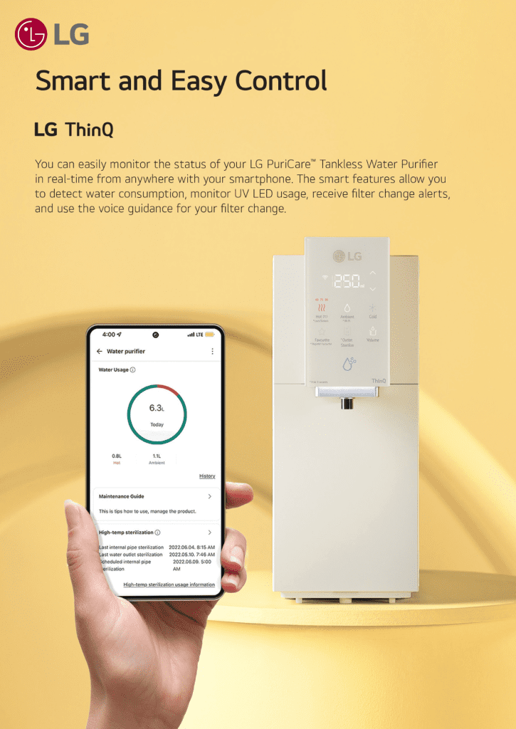 Download LG ThinQ app in your smartphone and easily check the status of your water purifier