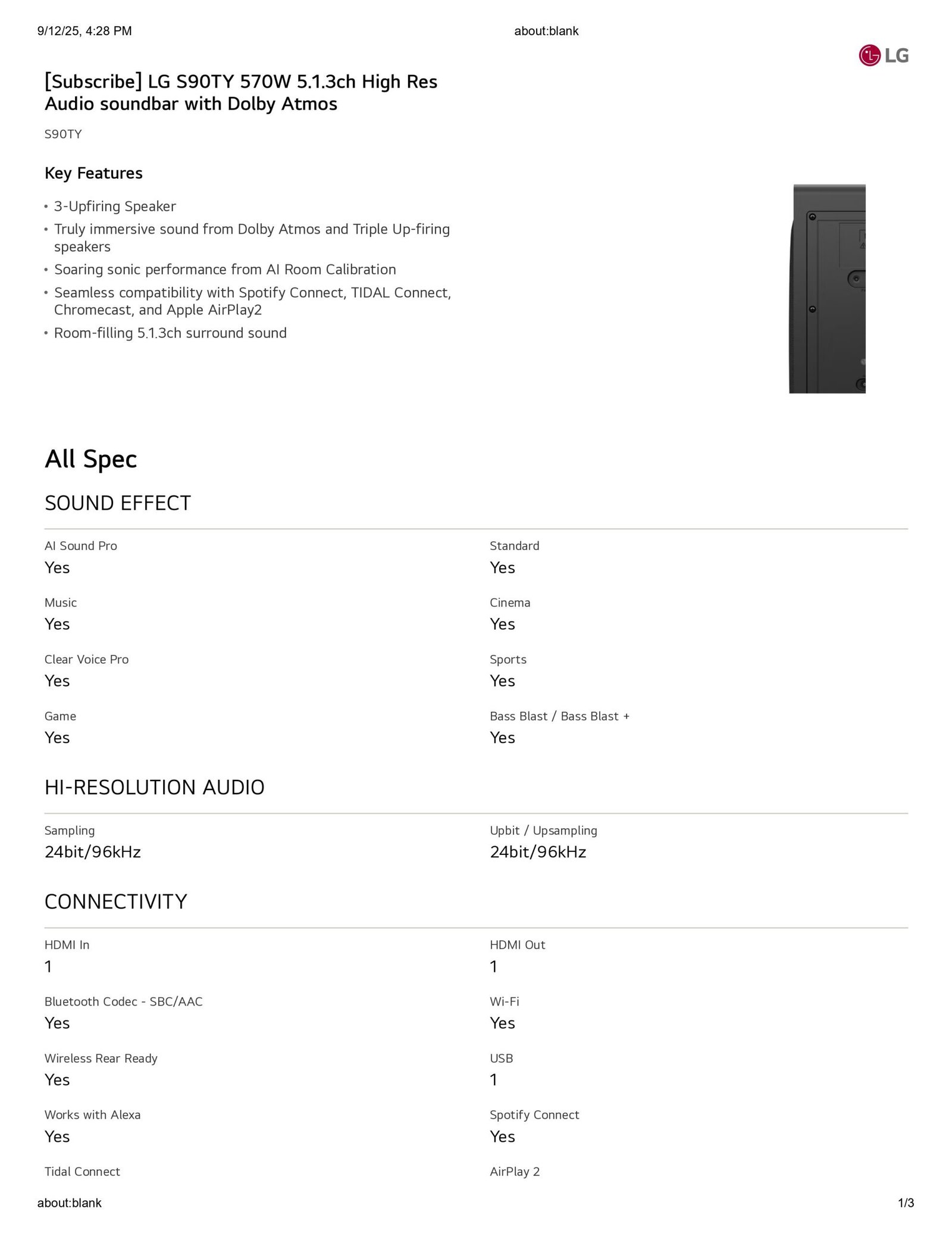 LG S90TY 570W 5.1.3ch High Res Audio soundbar with Dolby Atmos