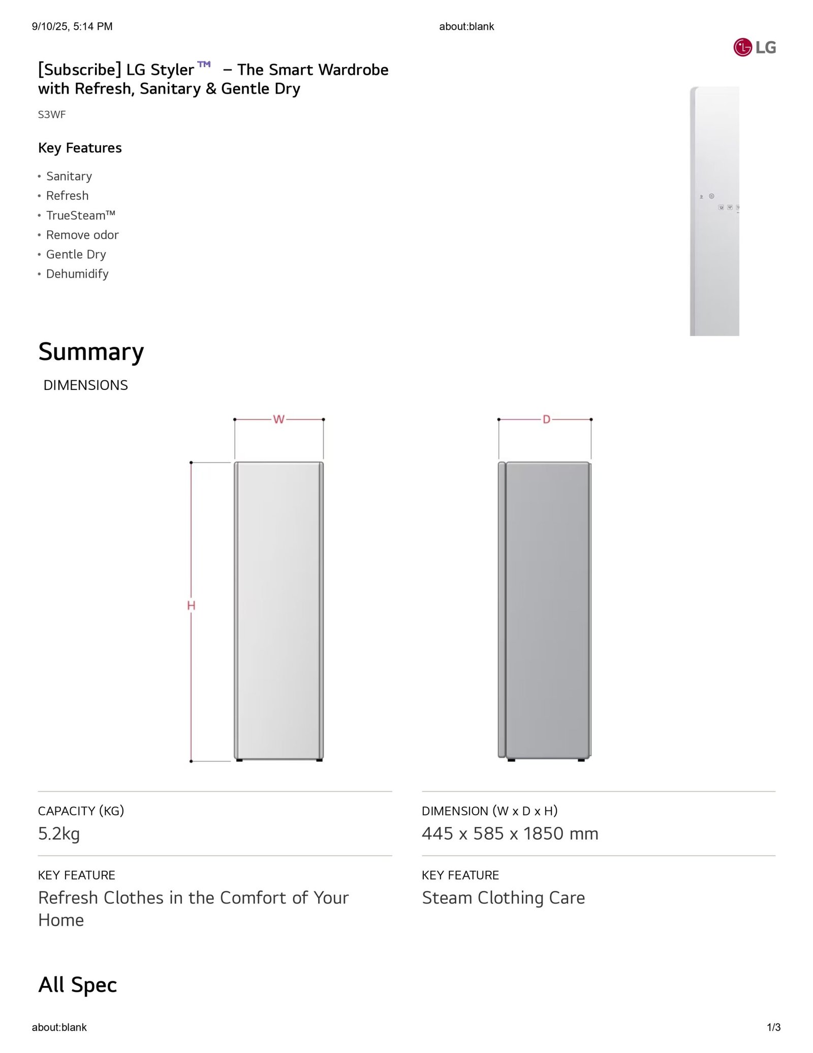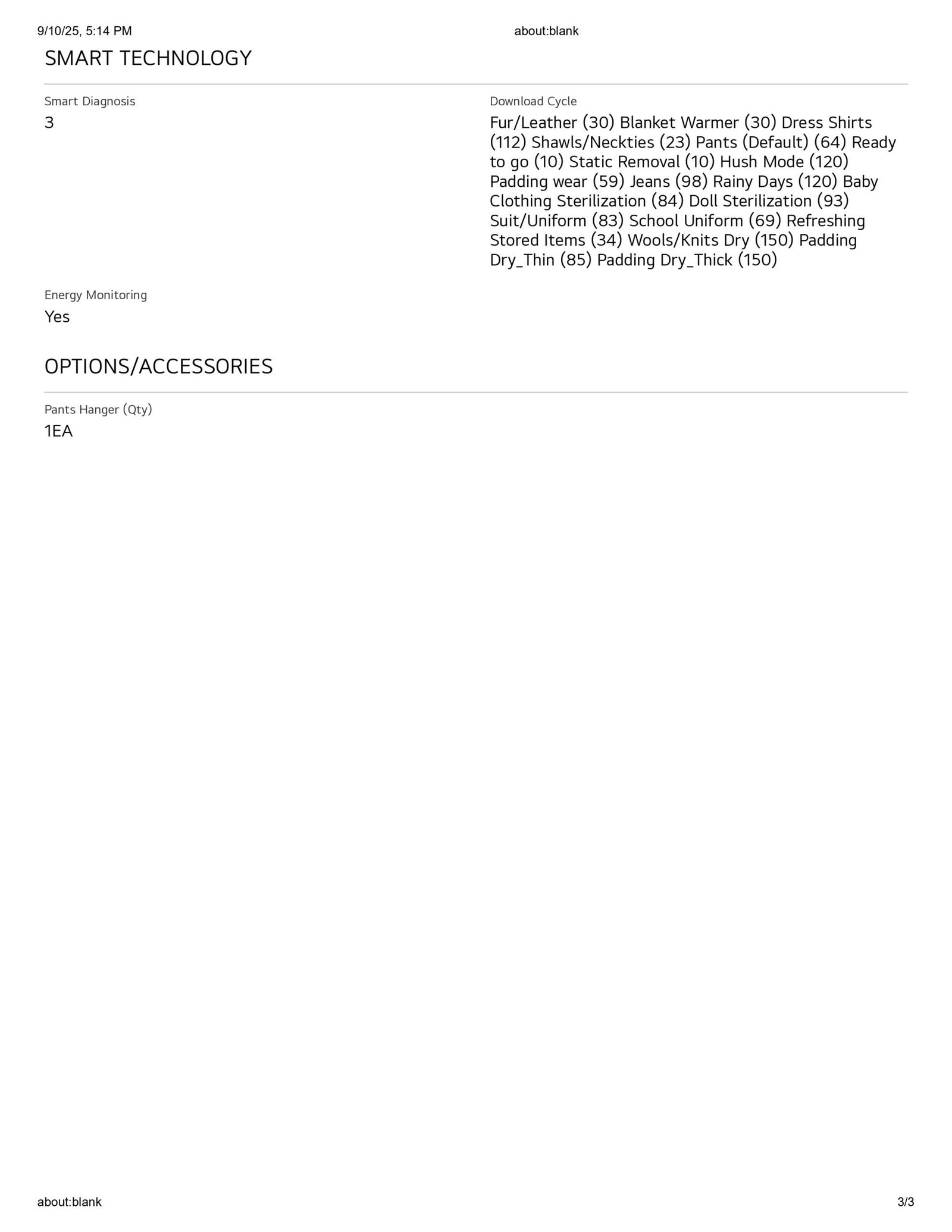 Special Features: Pants Crease Care, Hush Mode, Static Removal, Ready-to-Go function, Refreshing Stored Items