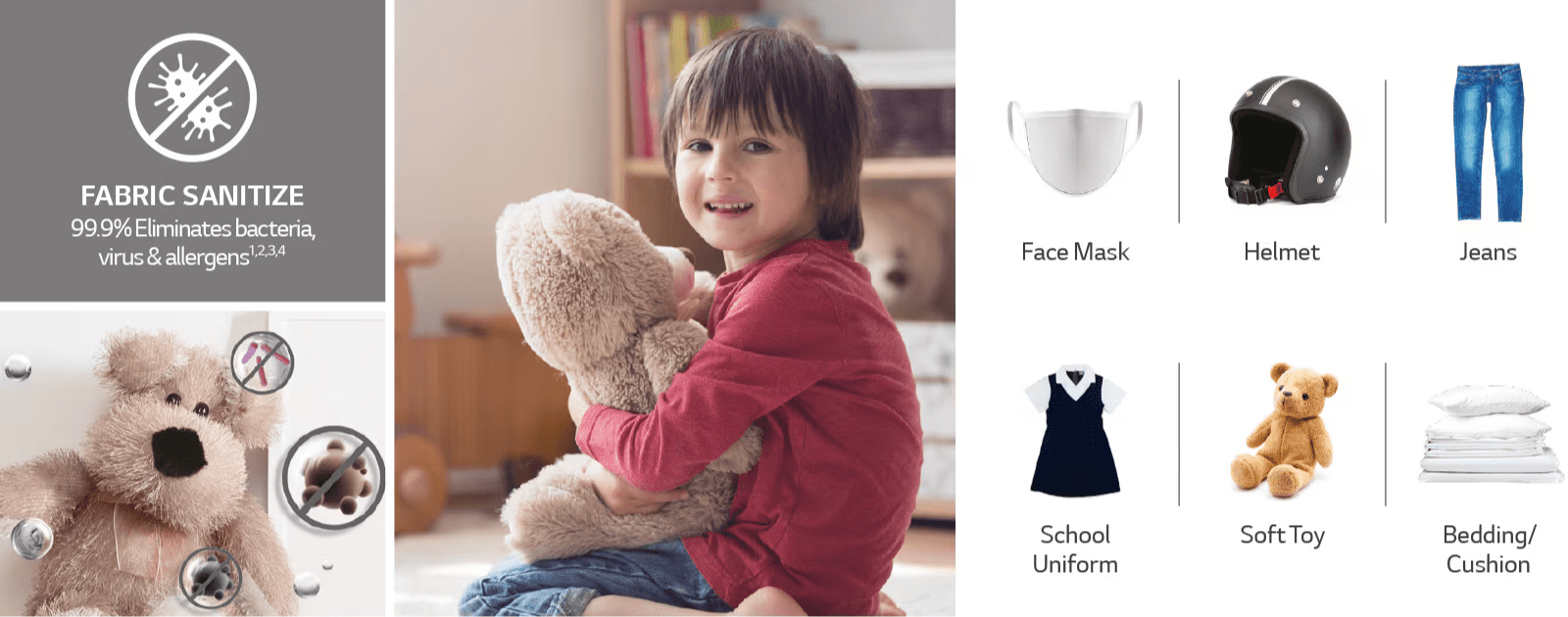 The Sanitize cycle powered by TrueSteam™ helps reduce allergens, bacteria and viruses in clothes, bedding, sportwear and even children’s soft toys.